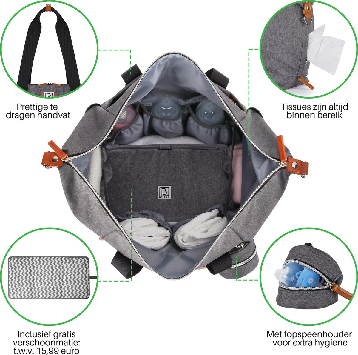 Brisby Slijtvaste Luiertas – Verzorgingstas Groot – Grijs – Inclusief Verschoonmatje – Isoleervakken – Fopspeen Houder – Makkelijk Te Bevestigen Aan De Kinderwagen