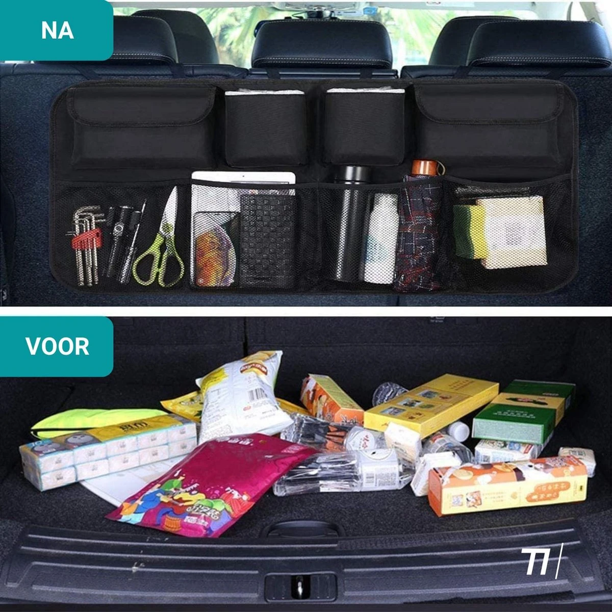 Met deze TIKKENS Auto Organizer voor in de Kofferbak houdt je te allen tijden de koffer van je auto op orde en netjes! Ook prima voor opslag en organisatie van bagage tijdens vakantie of door de week. Beschermt ook de achterkant van je zetels tegen krassen, vlekken en andere schade. Makkelijk te monteren op zo goed als elke auto achterbank. Een must-have voor je koffer georganiseerd en op orde te houden!